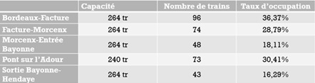 Entre Dax et Bayonne, il est de 43 trains (capacité : 240 trains au pont sur l’Adour) : 11 TGV, 24 TER et 9 trains de fret (4 entre Bayonne et Hendaye). Ce sont les trafics enregistrés par SNCF Réseau .