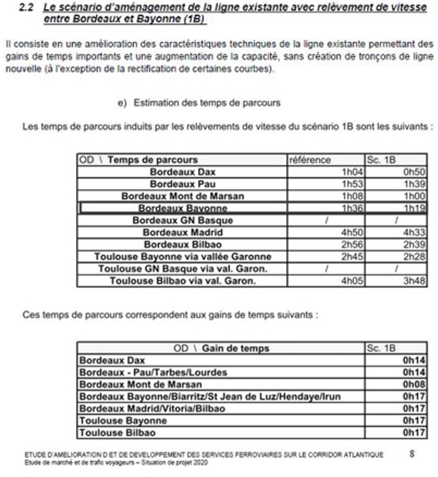 Avec ce scénario le temps de parcours entre Bordeaux et Bayonne serait de 1H19, il est de 1H15 avec la ligne à grande vitesse !