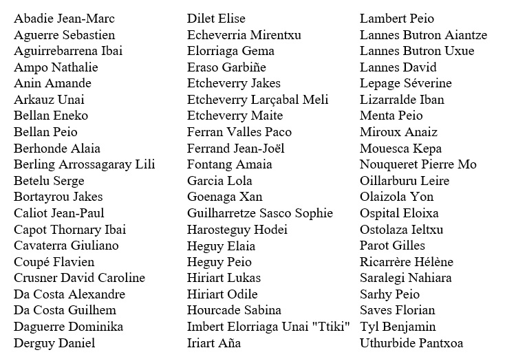 Abadie Jean-Marc, Aguerre Sebastien, Aguirrebarrena Ibai, Ampo Nathalie, Anin Amande, Arkauz Unai, Bellan Eneko, Bellan Peio, Berhonde Alaia, Berling Arrossagaray Lili, Betelu Serge, Bortayrou Jakes, Caliot Jean-Paul, Capot Thornary Ibai, Cavaterra Giuliano, Coupé Flavien, Crusner David Caroline, Da Costa Alexandre, Da Costa Guilhem, Daguerre Dominika, Derguy Daniel, Dilet Elise, Echeverria Mirentxu, Elorriaga Gema, Eraso Garbiñe, Etcheverry Jakes, Etcheverry Larçabal Meli, Etcheverry Maite, Ferran Valles Paco, Ferrand Jean-Joël, Fontang Amaia, Garcia Lola, Goenaga Xan, Guilharretze Sasco Sophie, Harosteguy Hodei, Heguy Elaia, Heguy Peio, Hiriart Lukas, Hiriart Odile, Hourcade Sabina, Imbert Elorriaga Unai « Ttiki », Iriart Aña, Lambert Peio, Lannes Butron Aiantze, Lannes Butron Uxue, Lannes David, Lepage Séverine, Lizarralde Iban, Menta Peio, Miroux Anaiz, Mouesca Kepa, Nouqueret Pierre Mo, Oillarburu Leire, Olaizola Yon, Ospital Eloixa, Ostolaza Ieltxu, Parot Gilles, Ricarrère Hélène, Saralegi Nahiara, Sarhy Peio, Saves Florian, Tyl Benjamin, Uthurbide Pantxoa