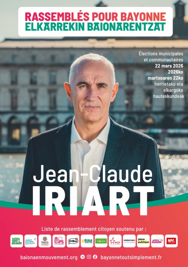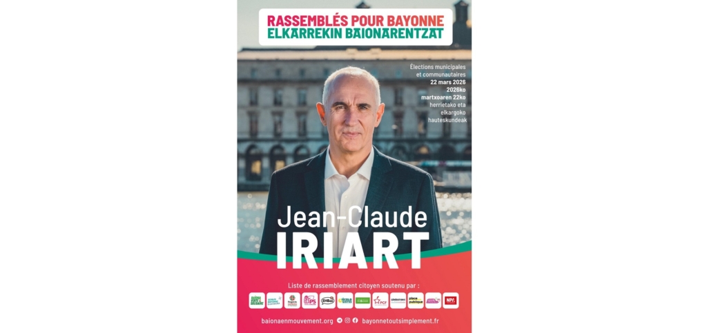Ezkerreko hautagai abertzale eta euskalduna buru, Elkarrekin Baionarentzat zerrenda aurkeztuko da igande honetako Baionako herriko bozetan. Baionako ezkerreko indar guziak bildurik, herriko etxea zentro eskuinari irabazteko aukera erreala da; aukera historikoa. Bozka guziak behar-beharrezkoak izanen dira.