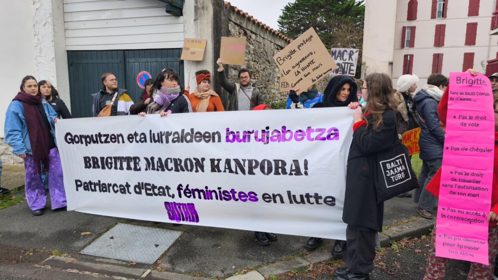 7 janvier : le collectif transféministe Sutan manifeste contre la visite de Brigitte Macron venue à l’hôpital de Baiona pour lancer une opération Pièces jaunes.