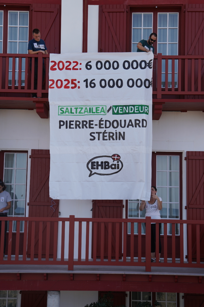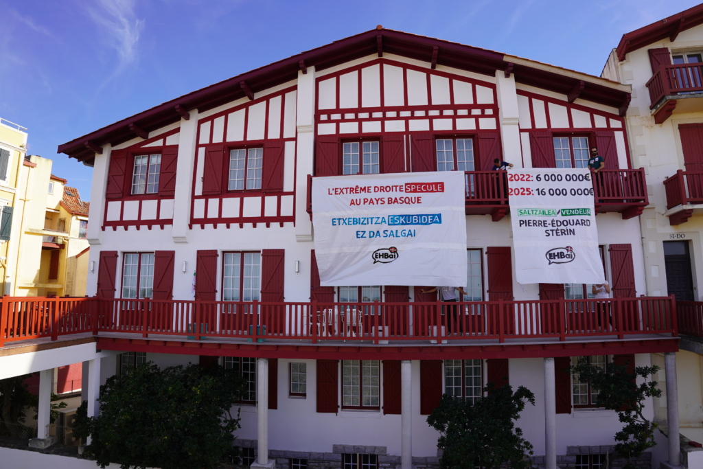 Urriaren 3an, arratsalde bukaeran, EHBaiko hamar bat kidek bi banderola zabaldu dituzte Pierre-Édouard Stérinen etxean. Horrela, Ipar Euskal Herriko biztanleen bizkarrean eskuin muturreko milioidunaren 10 milioi euroko higiezin espekulazioa salatzeko. Militante abertzaleek zabaldutako banderoletan hurrengoa irakur zitekeen: “Eskuin muturrak Euskal Herrian espekulatzen du” eta “Etxebizitza eskubidea ez dago salgai”. Igorritako mezua argia da: eskuin muturrak eta espekulazioak ez dute lekurik, ez Euskal Herrian ez eta beste inon.