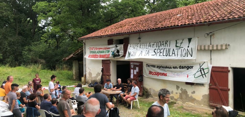 Jenofa Berhokoirigoin - Argia.eus - Ekainaren 27an abiatu dute okupazioa Lurzaindia fundazioak, ELB sindikatuak, Ostia kolektiboak eta senpertar talde batek, etxebizitza eta laborantza lurren salmenta espekulatiboa geldiarazteko xedez. Senperen, 1,3 milioi eurotan salgai dira egoera txarrean den etxe bat, zazpi hektareako laborantza lurra, bi hektareako urmael bat eta oihan eremu zabal bat.