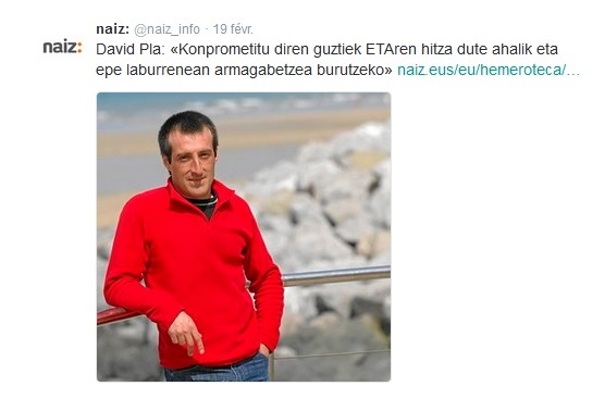 Le quotidien Gara a publié ce dimanche 19 février une interview en euskara du porte-parole de l'organisation ETA, David Pla, actuellement incarcéré à Paris(*). Celui qui est délégué d'ETA en charge de la résolution du conflit analyse la situation de ces derniers mois, notamment après les évènements de Louhossoa, le débat mené au sein du collectif des prisonniers politiques basques et au sein de la gauche abertzale. David Pla y annonce qu'un processus de réflexion ouvert à tous les militants d'ETA va s'ouvrir à partir de ce printemps.