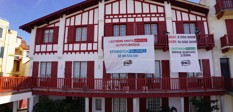 Urriaren 2an, arratsalde bukaeran, EHBaiko hamar bat kidek bi banderola zabaldu dituzte Pierre-Édouard Stérinen etxean. Horrela, Ipar Euskal Herriko biztanleen bizkarrean eskuin muturreko milioidunaren 10 milioi euroko higiezin espekulazioa salatzeko. Militante abertzaleek zabaldutako banderoletan hurrengoa irakur zitekeen: “Eskuin muturrak Euskal Herrian espekulatzen du” eta “Etxebizitza eskubidea ez dago salgai”. Igorritako mezua argia da: eskuin muturrak eta espekulazioak ez dute lekurik, ez Euskal Herrian ez eta beste inon.