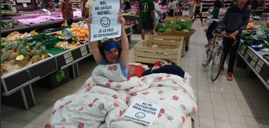 150 personnes ont occupé un supermarché à Bayonne pour dénoncer le travail le dimanche, à l'occasion du week-end des 10 ans du mouvement Bizi qui œuvre depuis 2009 en Pays Basque sur les terrains de l'urgence climatique et de la justice sociale.
