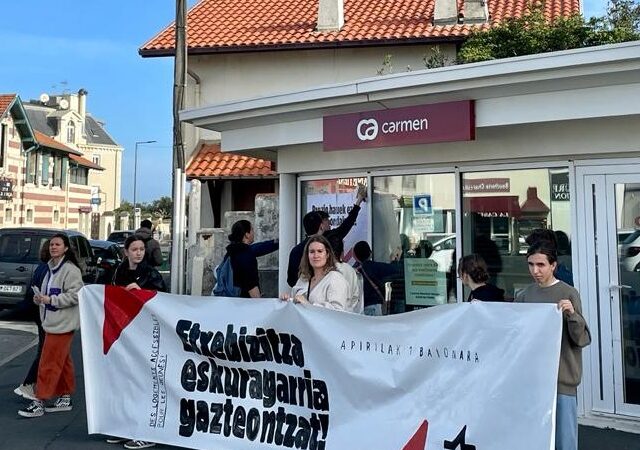 XUTI GAZTE! - Gaur, martxoaren 25 honetan, hainbat gazte elkartu gara Miarritzeko Carmen immobilier agentzian. Datuak kezkagarriak dira, urtean 20 000 etxebizitza turistikotik gora daude alokagai Ipar Euskal Herrian, 42 235 bigarren etxebizitza eta 11 904 etxe huts daude, eta herri batzuetan bigarren etxebizitza kopurua %40a baina gehiago da. Ikasleok gure gastuen %65a baino gehiago bideratzen dugu etxebizitzara, eta hala ere, 2020.urtean 11 699 etxebizitza sozial eskatu baldin baziren ere 1 223 bakarrik banatu ziren.